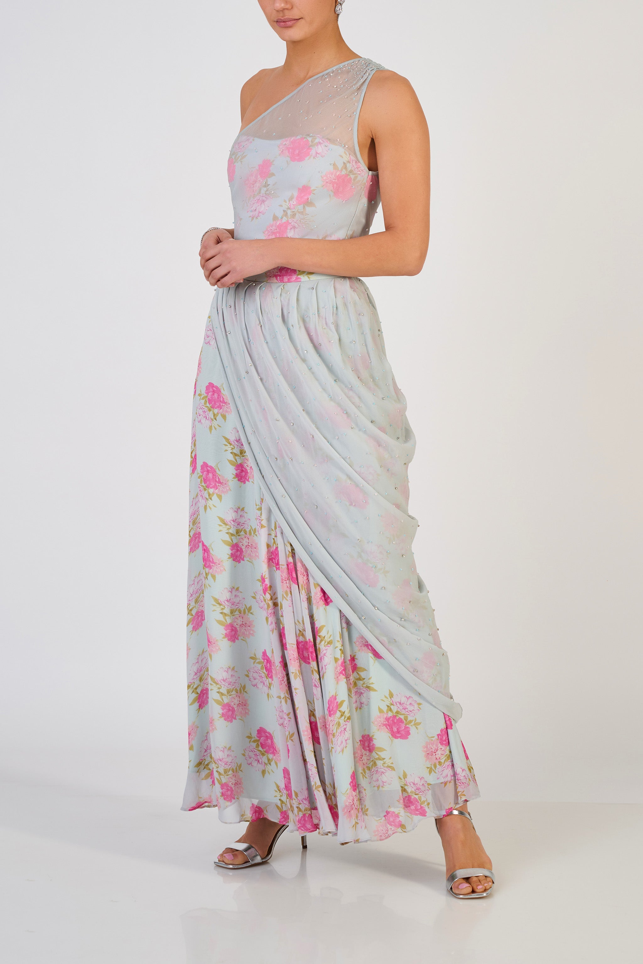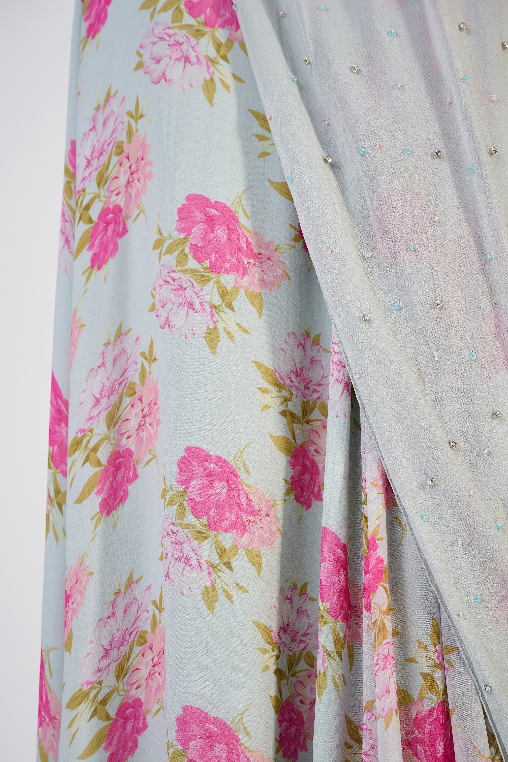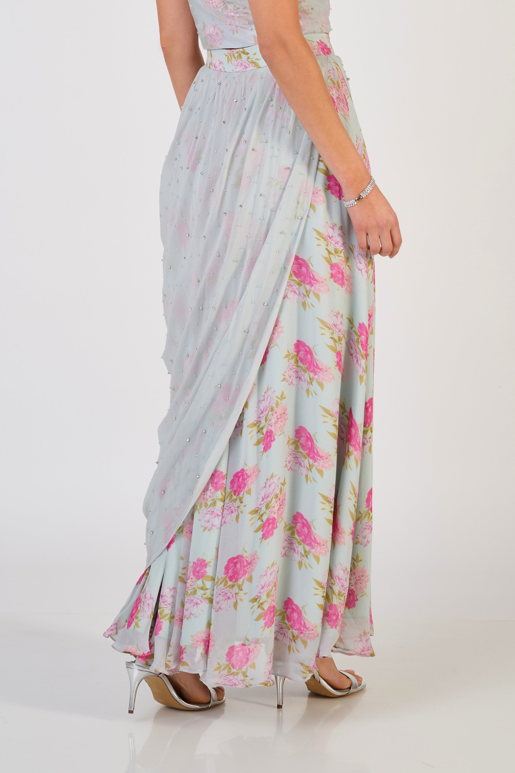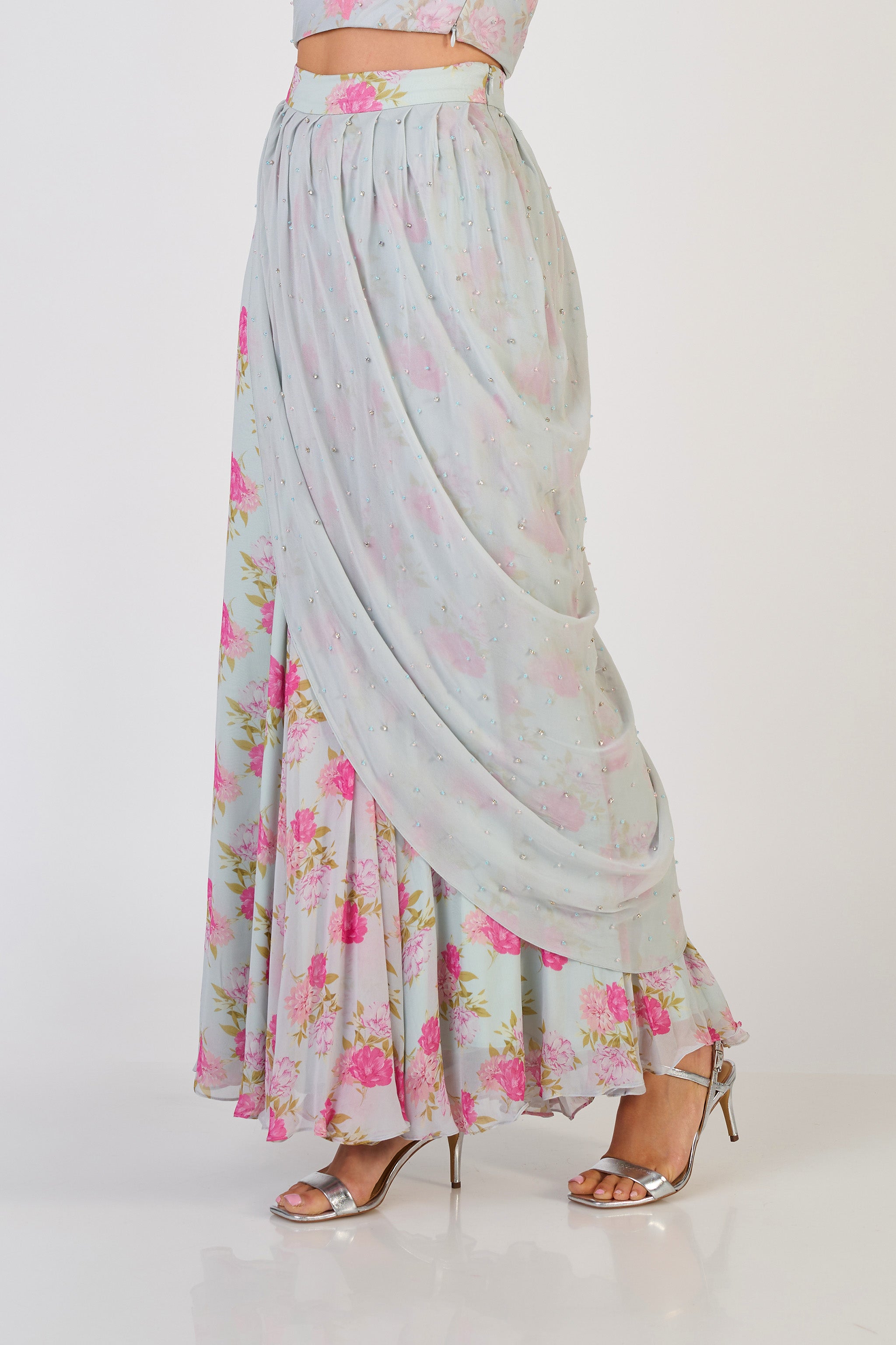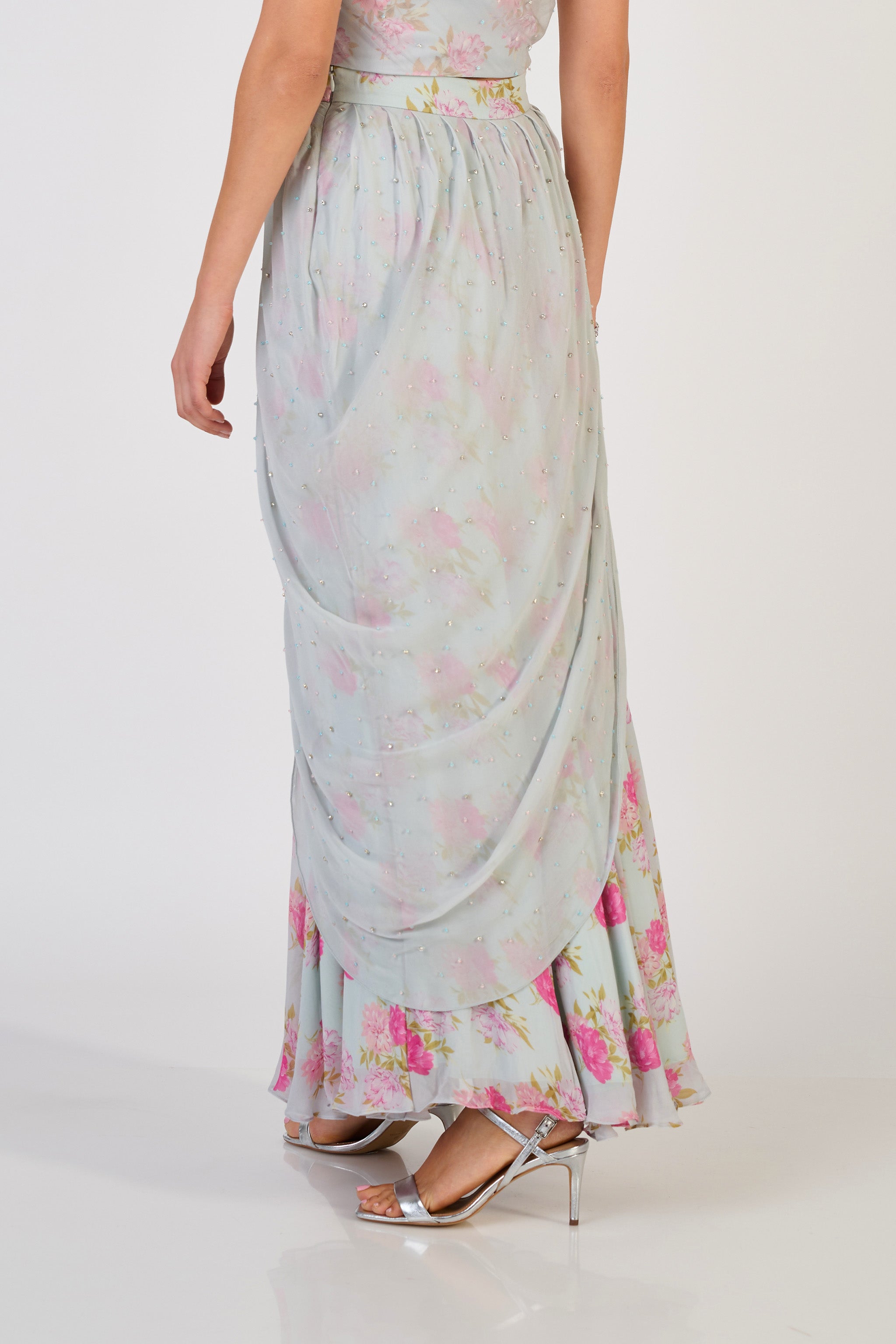 The Aaina Saree Drape Skirt has a beautiful floral peony print layered with beading placed delicately throughout the drape section. The skirt looks stunning styled with the One shoulder layered top. The draping and pleating mimics the traditional Indian sari. Crystals and beading catch the light beautifully and the light georgette fabric make it a great summer piece for your wardrobe.
