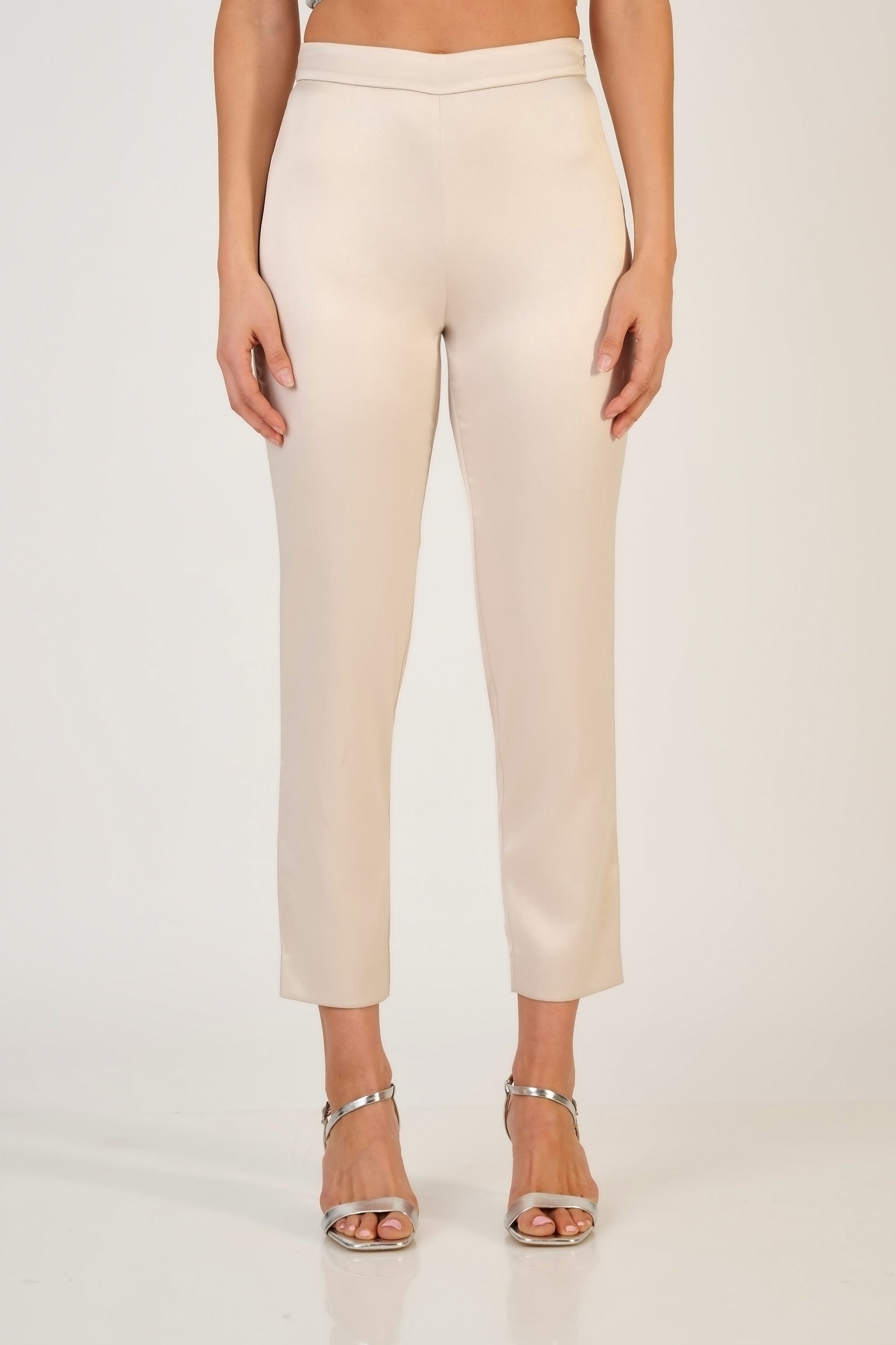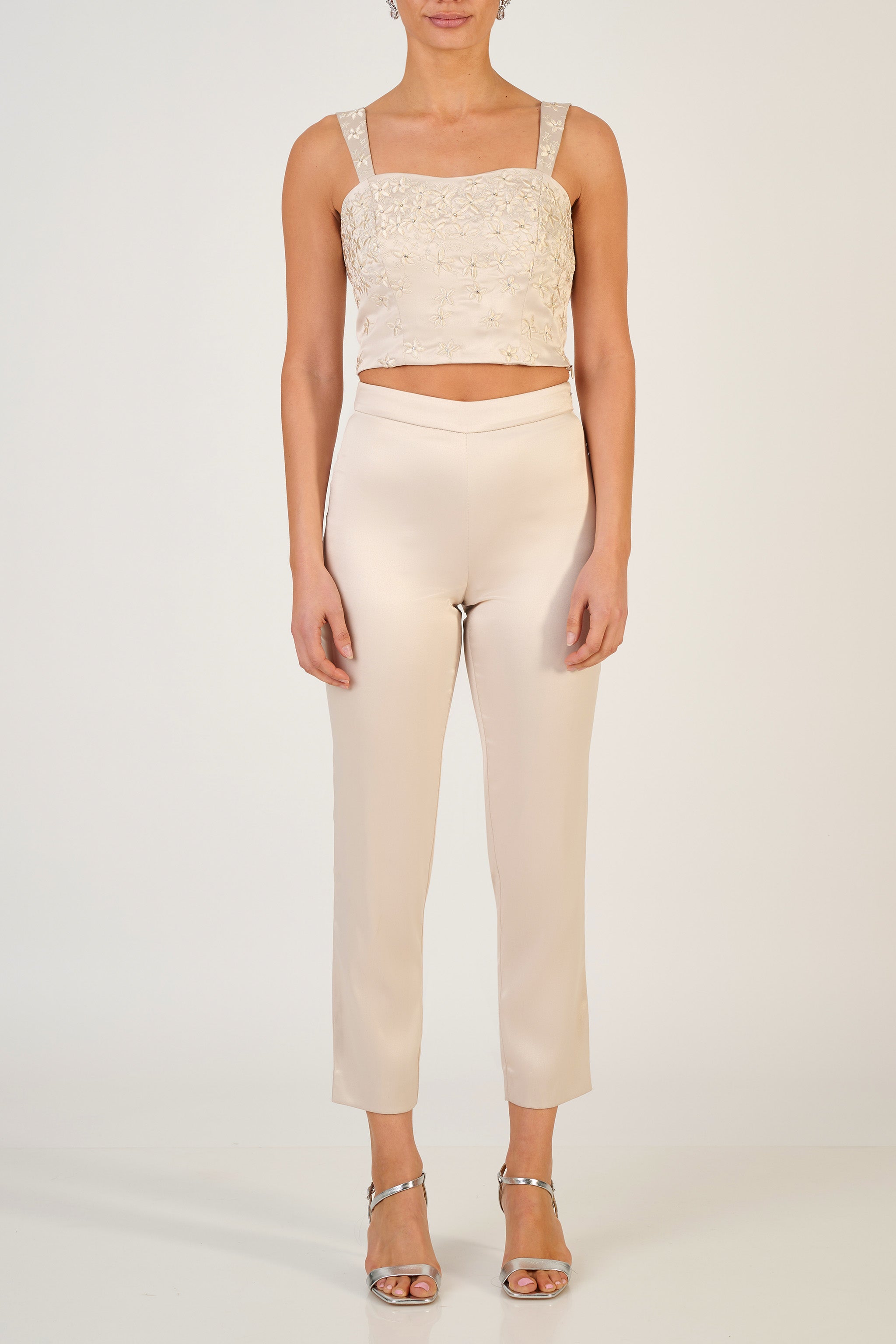 The Adhira High Waist Trouser have been designed as a staple piece in the Rekha Mistry collection. These elegant, cigarette style Duchess Satin trousers are designed to be worn with the Eesha Embroidered Bustier. The trousers are high waist, cropped and slim leg and are fastened with a side zip. They can easily be dressed up or down depending on the event.