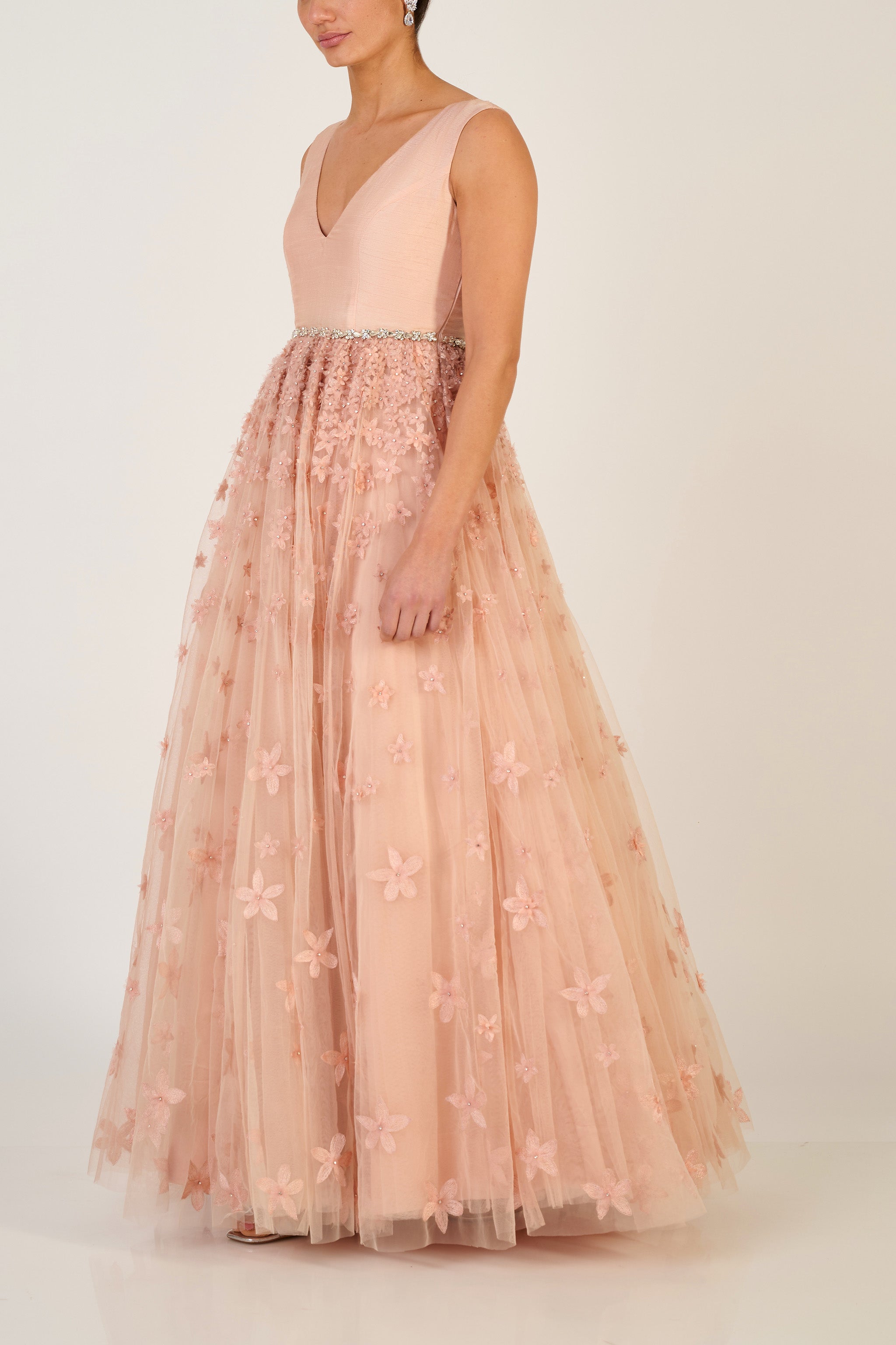Elegant and sophisticated, this is the perfect gown to wear to a special event. The design is an ode to the beautiful jasmine flowers that originate from India that scatter wherever they fall.Β