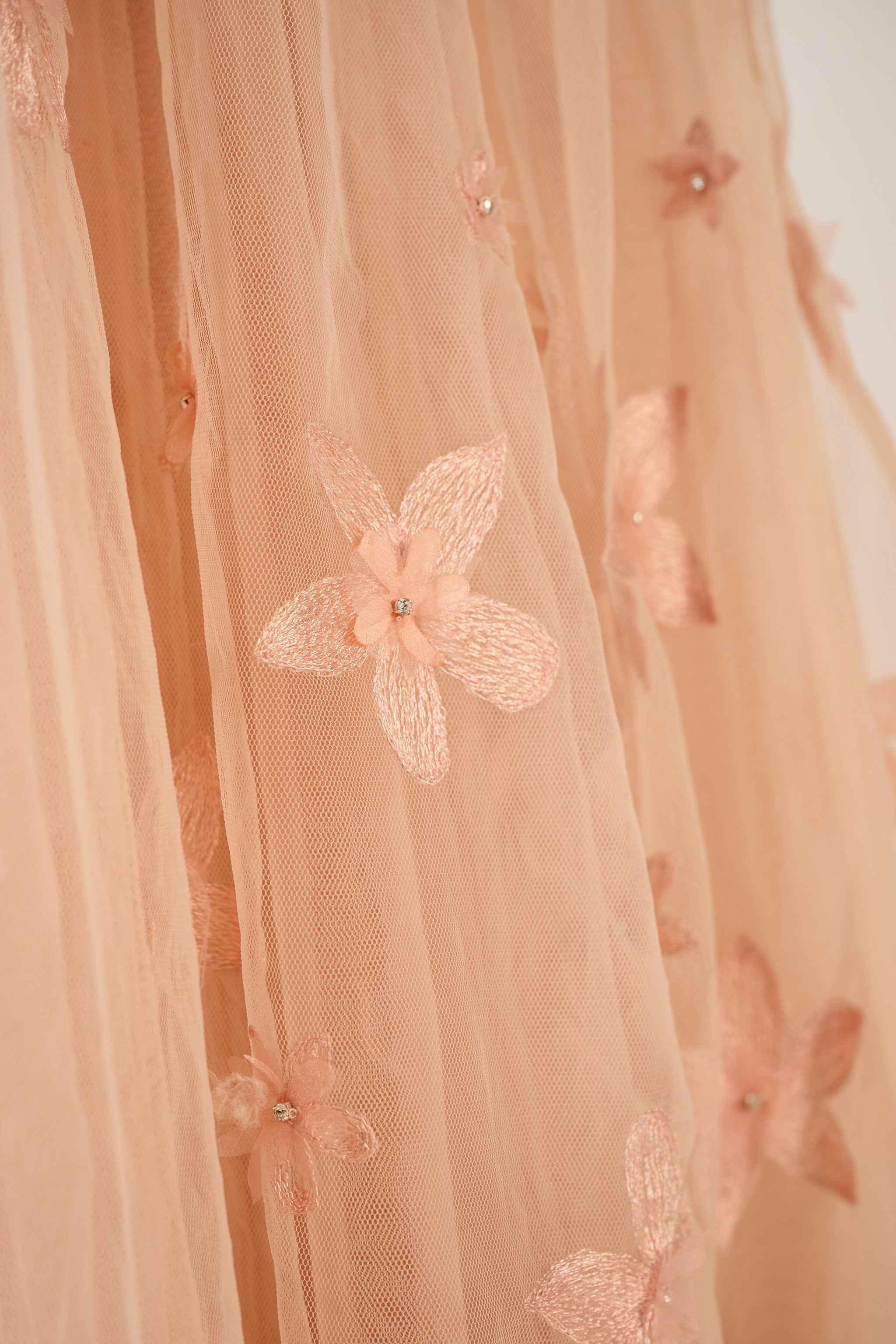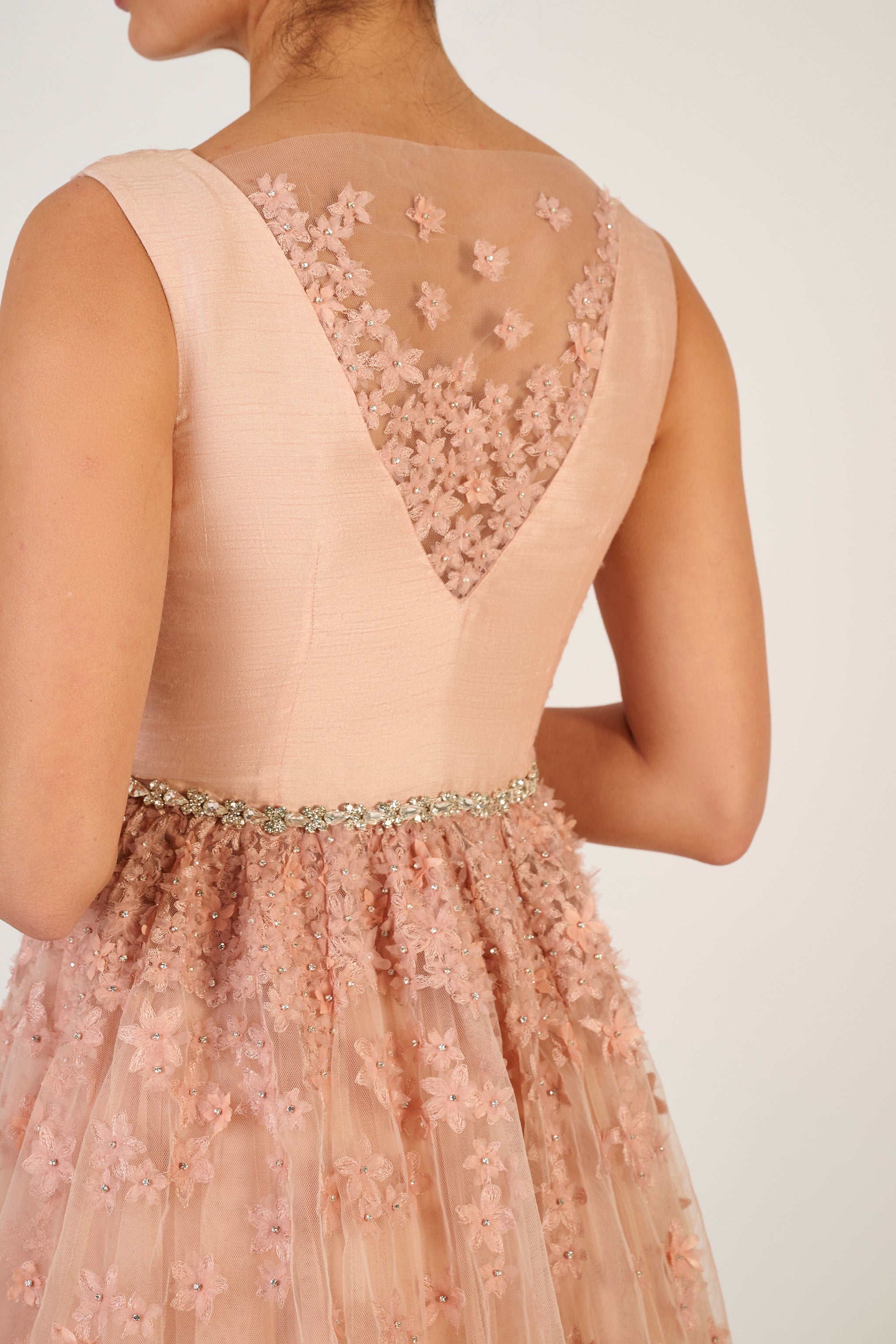 The Jasmine Tulle Gown is an iconic hero piece of the Rekha Mistry launch collection. The gown consists of hand embroidered jasmine flowers made from Dupion, Organza, and finished with a crystal. They are layered to give a 3D effect and create depth and intrigue. The sheer V back creates intrigue with an ombre effect of various sized jasmine flowers.