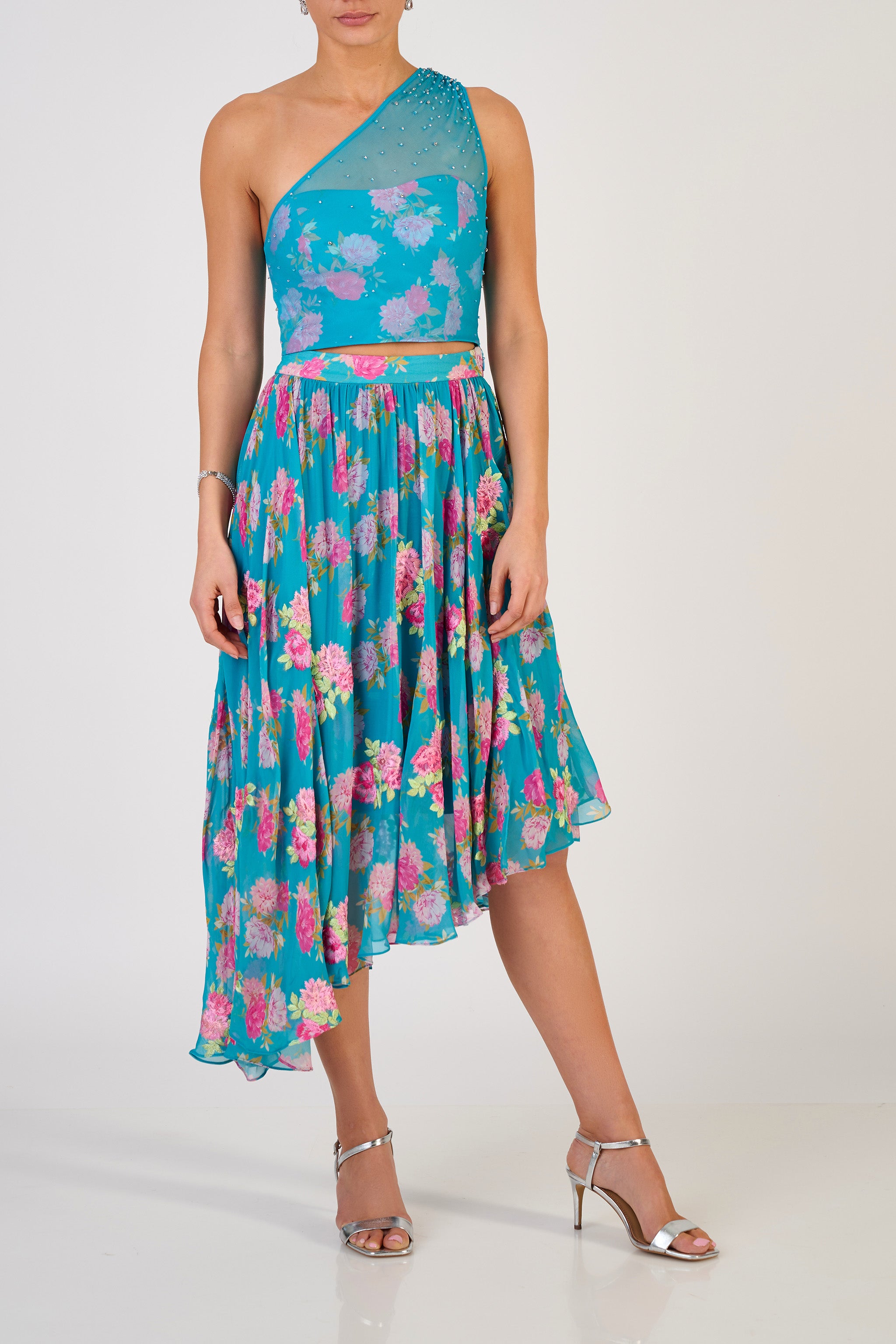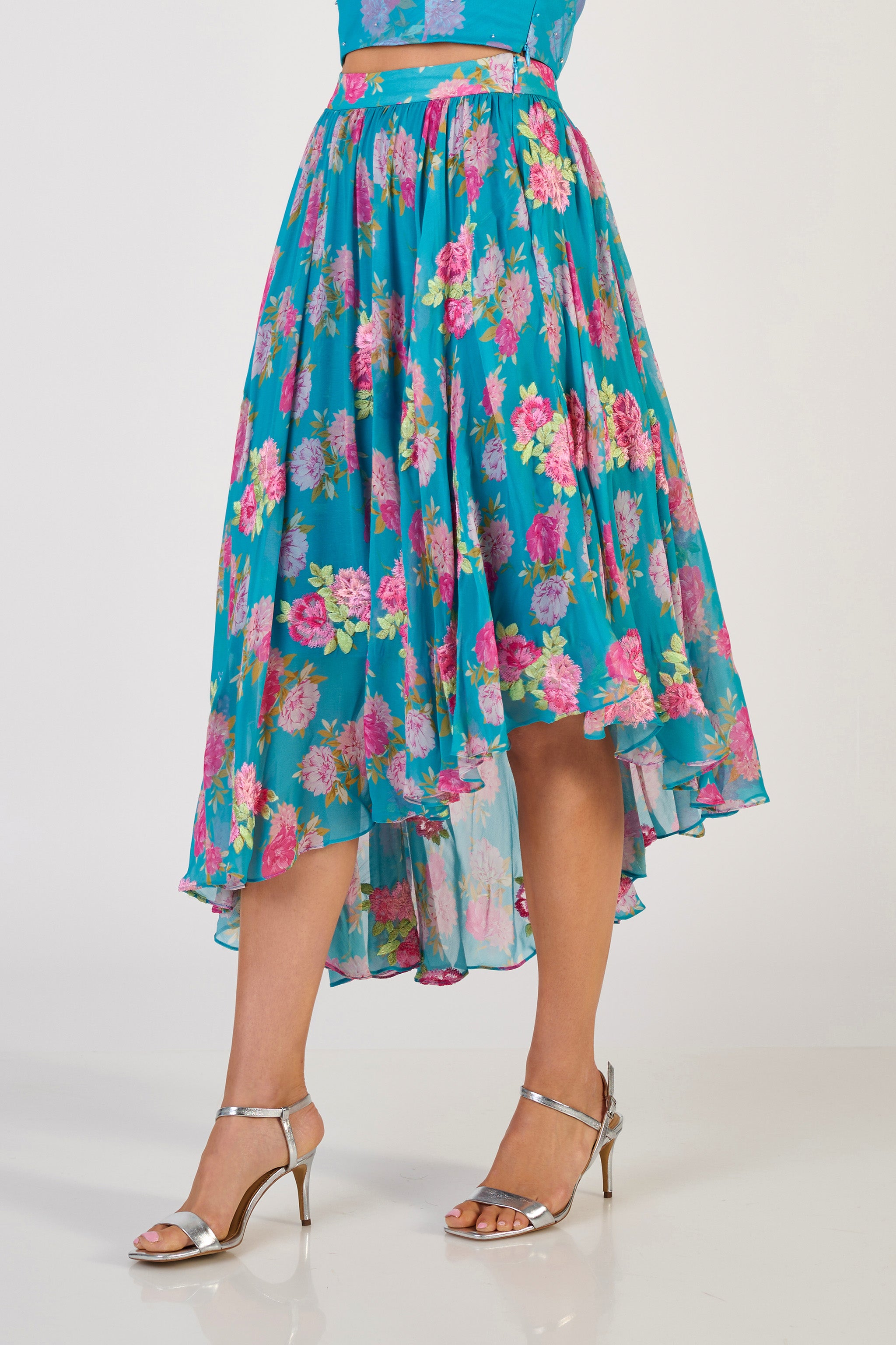 The Kashvi Asymmetric Skirt has an eye catching asymmetric hem line. Made from georgette fabric, it flows and moves elegantly. Drawing on the beautiful detail of the peony flower, the skirt is embroidered with thread work which catches the light. Subtle embroidery gives this a contemporary feel, and this skirt looks stunning with any top from the collection.