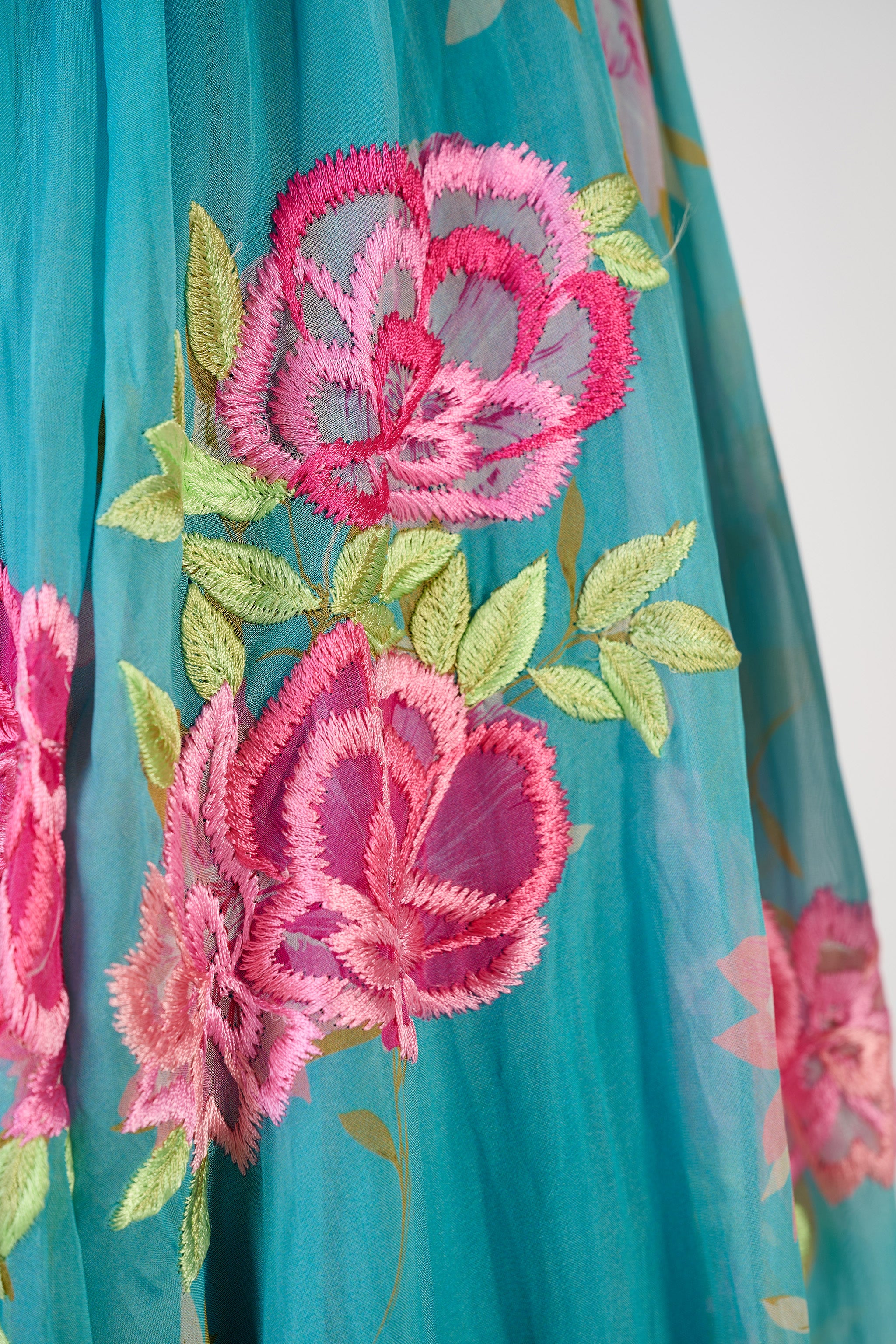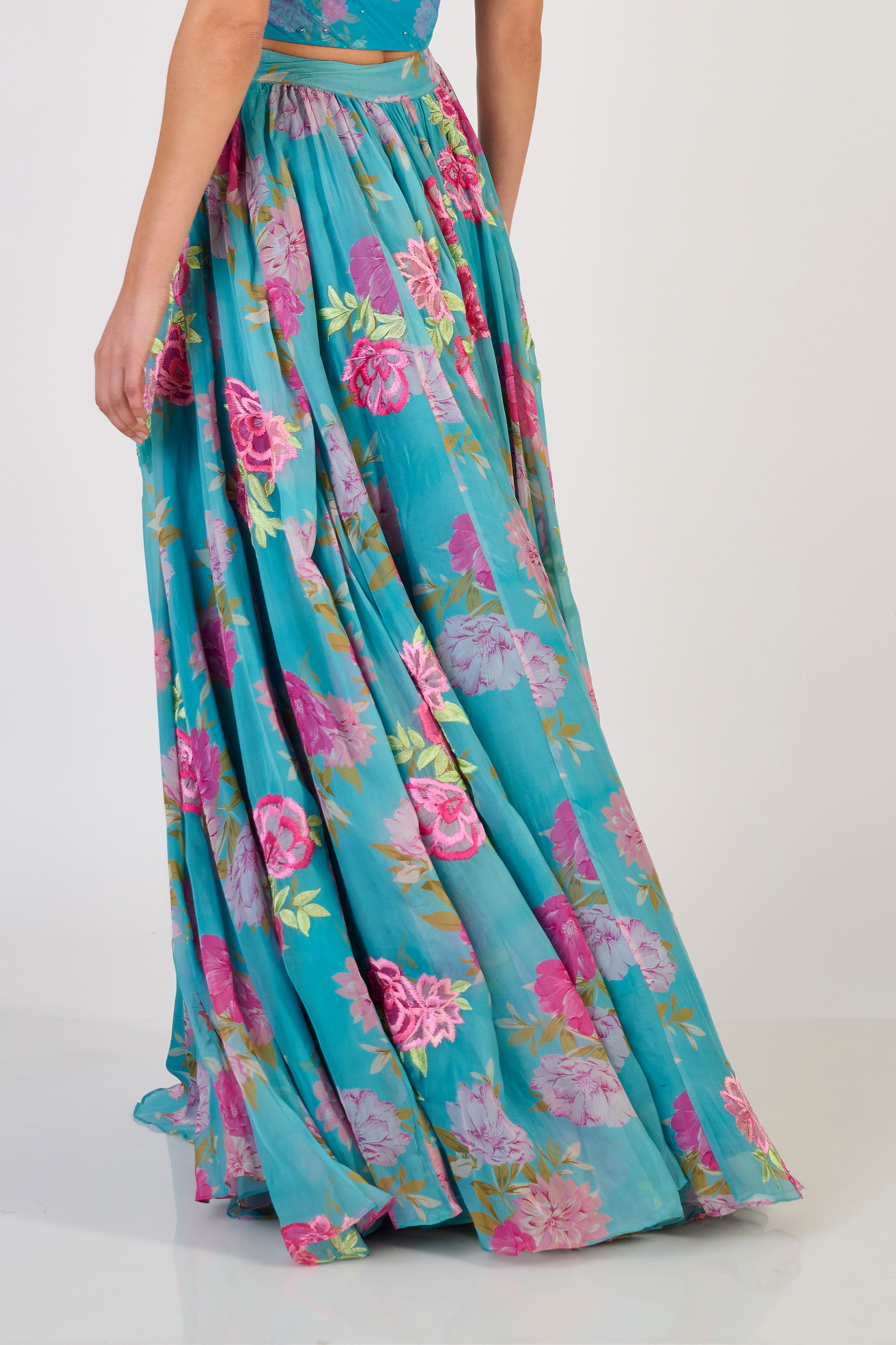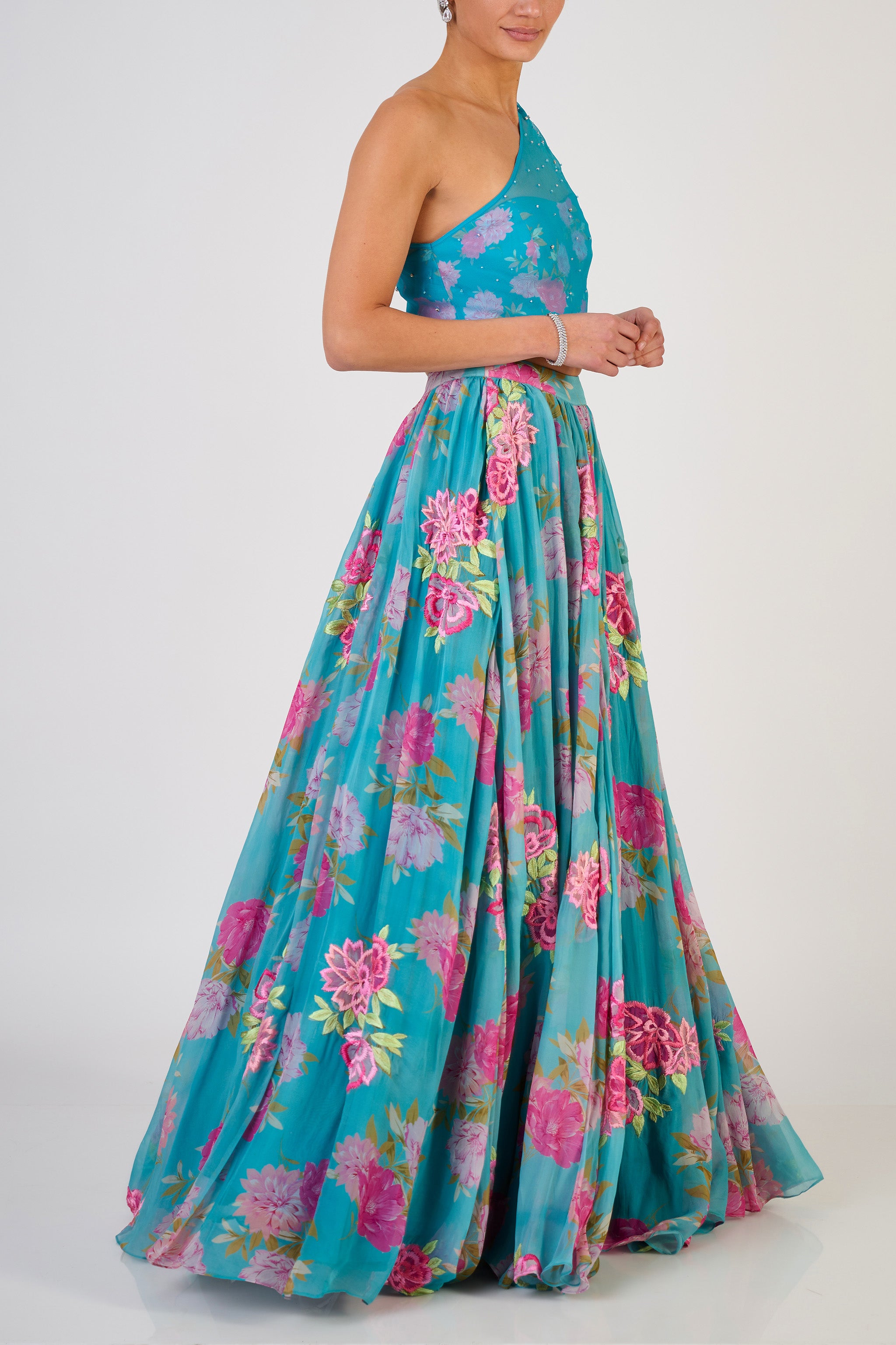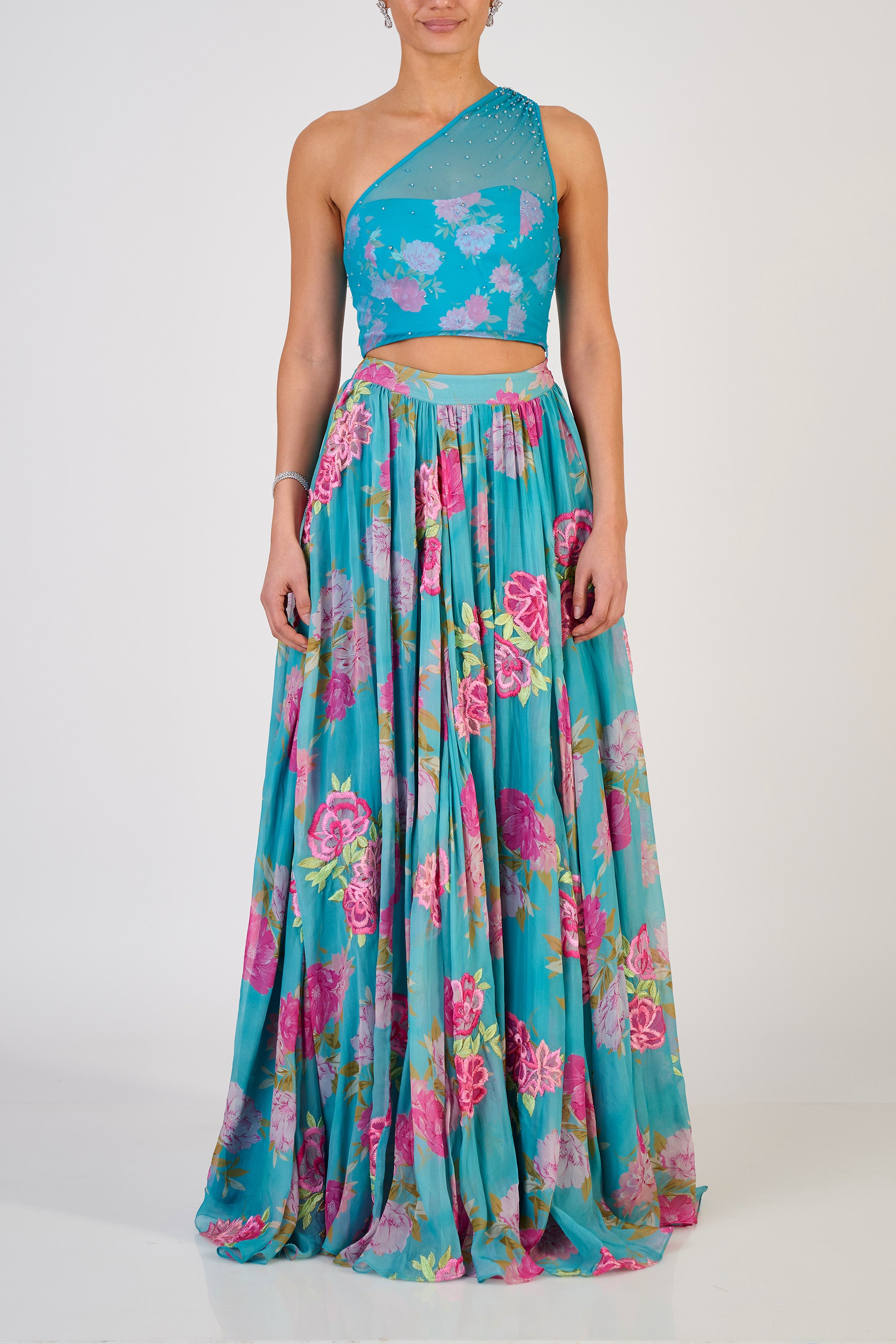 The Kiara Maxi Skirt is a hero piece in the collection and is available in both Spa Blue and Peacock Blue. This is a full circle skirt and is designed to be worn as a full look with the Aaina One Shoulder Layered Top. The print has embroidery detail throughout adding additional texture and allure.Β